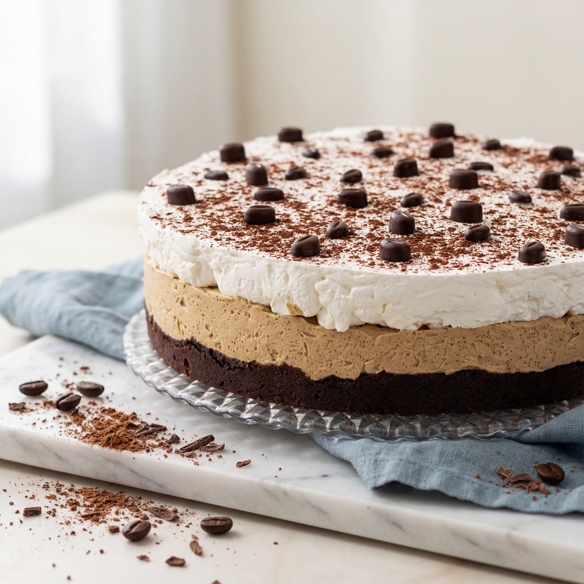 Kakaowy, mocno wilgotny biszkopt muśnięty kwaśną konfiturą porzeczkową, następnie krem kawowy z dodatkiem ajerkoniaku z bezą w środku, zwieńczony delikatną, bitą śmietaną, oprószony kawą.