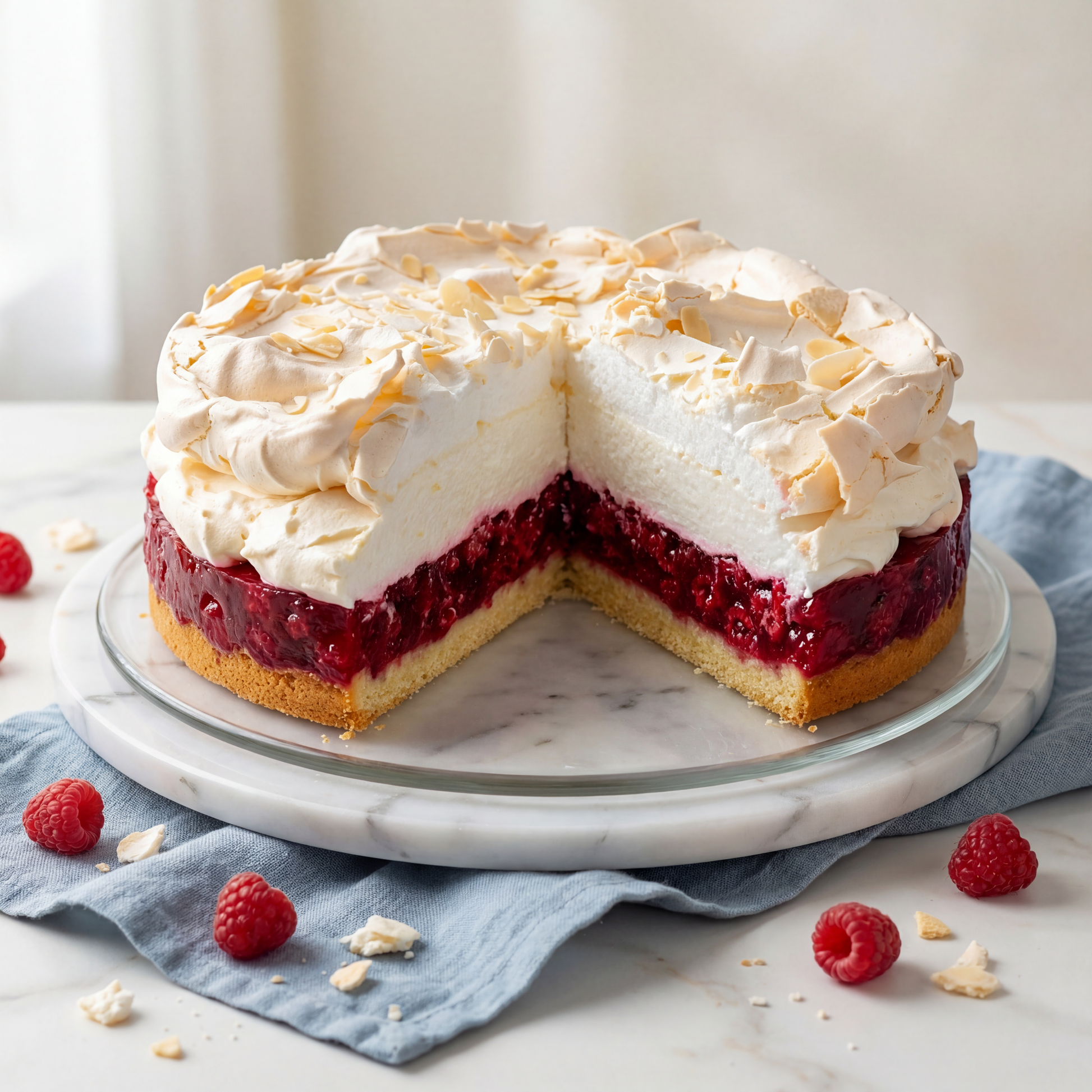 Kruchy spód, dużo malin zatopionych w galaretce malinowej, krem waniliowy, zwieńczony bezą.