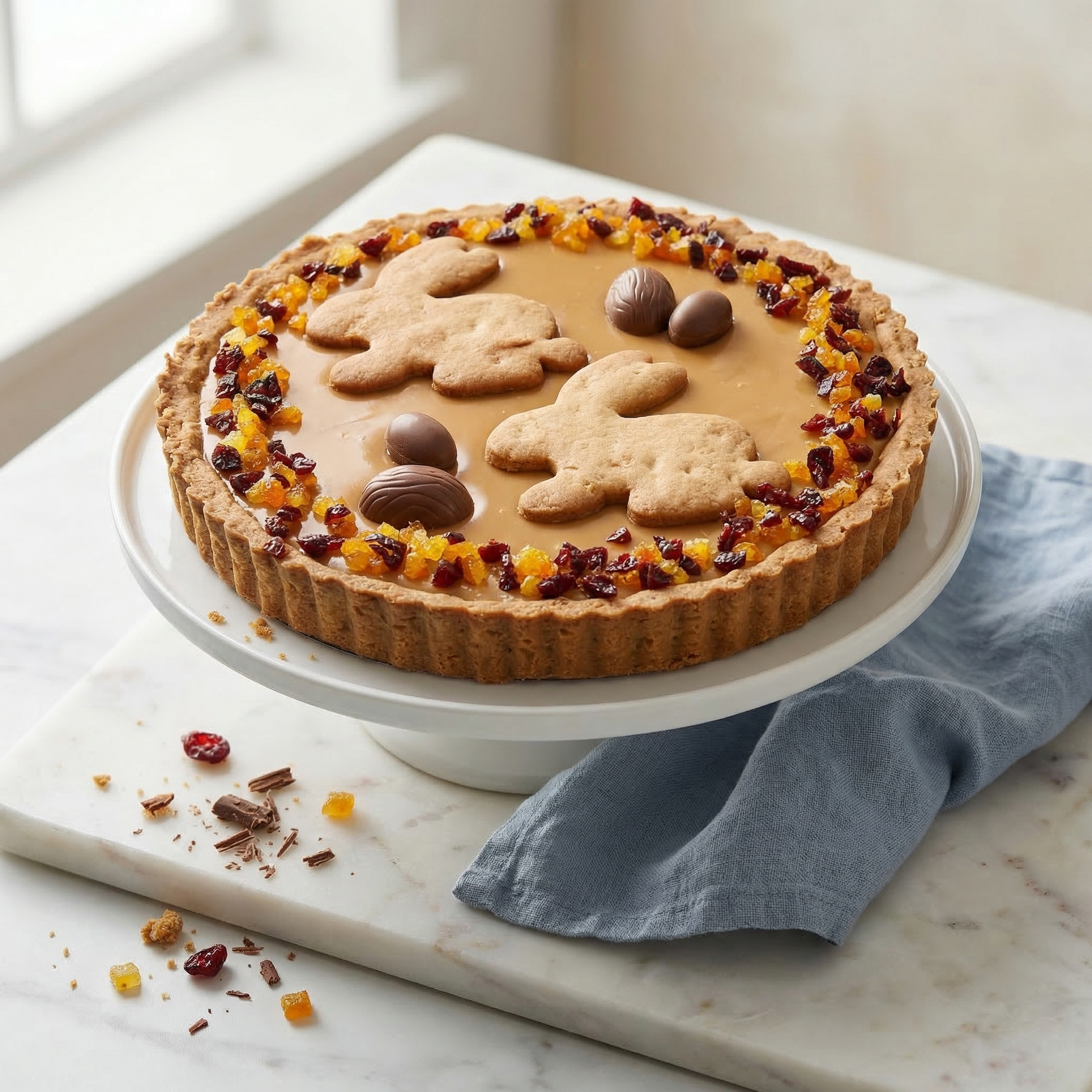 Wielkanoc bez mazurka się nie liczy. W naszej pracowni postawiliśmy na idealny, wyrafinowany balans smaków: kruchy, orzechowy spód przełamaliśmy lekko kwaskowatą konfiturą porzeczkową. Całość dopełnia aksamitny, gładki krem karmelowy oraz dodatek bakalii. To dopracowany w każdym calu rzemieślniczy wypiek, który będzie piękną ozdobą świątecznego stołu.