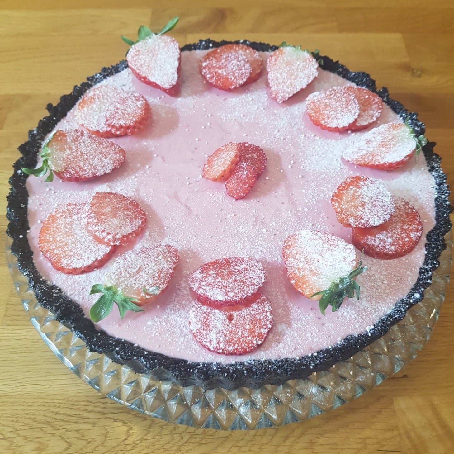 Krucha tarta z czekoladowych ciasteczek wypełniona aromatycznym musem truskawkowym, udekorowane owocami.