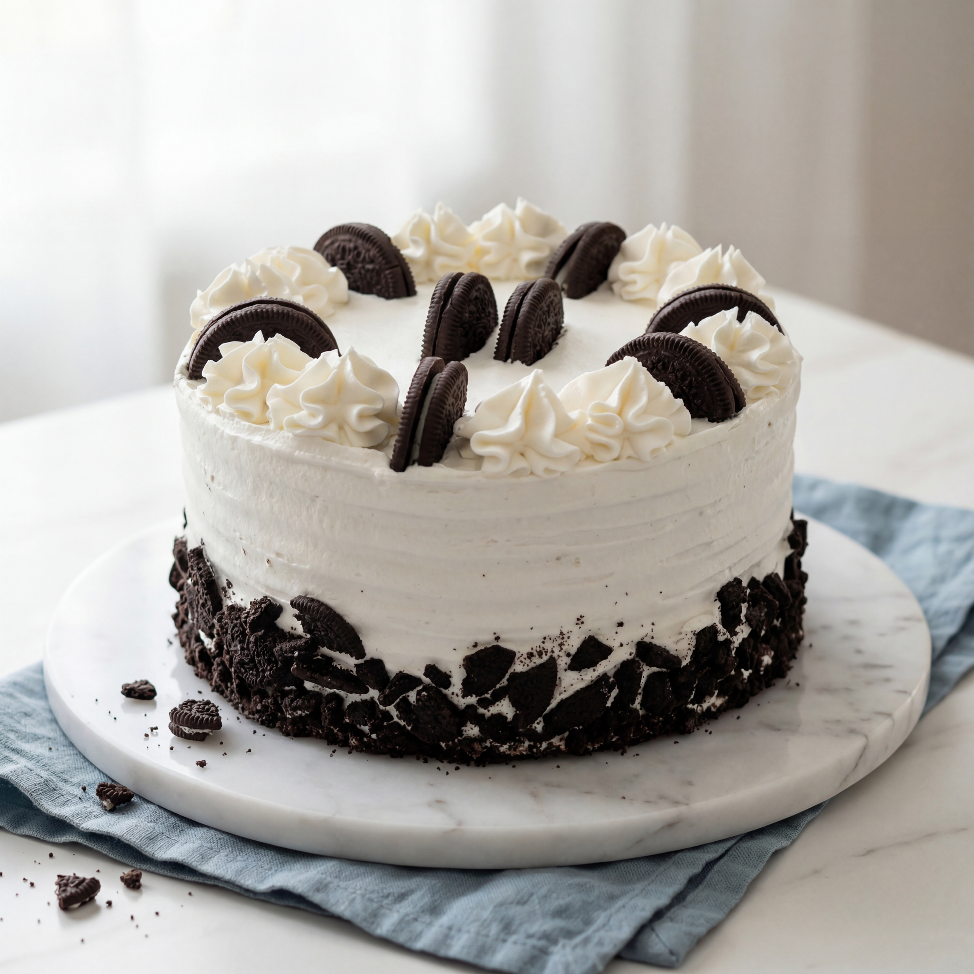 Klasyczny czekoladowy biszkopt przełożony kremem śmietankowym z kawałkami ciasteczek oreo, dodatkowo w dolnym przełożeniu warstwa chrupiącej praliny.