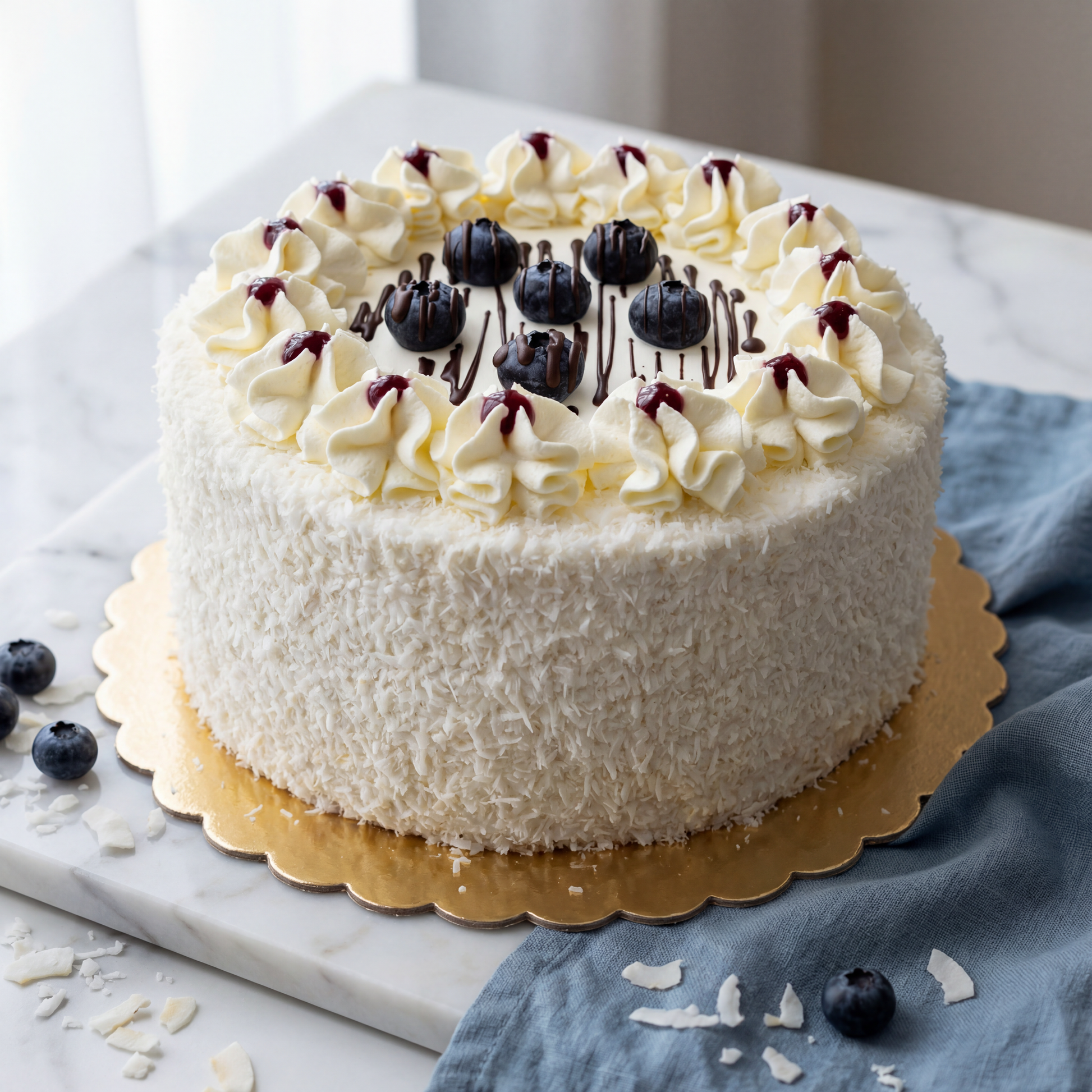 Delikatny, jasny biszkopt połączony waniliową, bitą śmietaną z kawałkami brzoskwiń. Boki obsypane wiórkami kokosowymi, góra udekorowana rozetami z bitej śmietany.